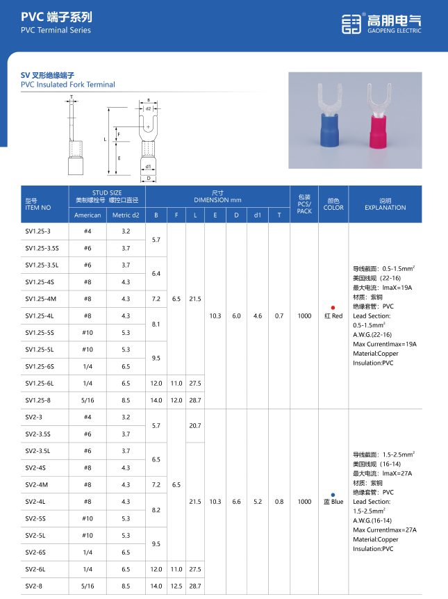 Gaopeng toffri varjetà ta' mudelli, inklużi SV1.25, SV2, SV3.5, SV5.5, SV8, SV14 u SV22, biex jissodisfaw dijametri differenti tal-wajer u ħtiġijiet ta' applikazzjoni. Din l-għażla wiesgħa tippermetti lill-klijenti jsibu l-prodott li l-aktar jaqbel mar-rekwiżiti speċifiċi tagħhom, filwaqt li tiżgura prestazzjoni u affidabbiltà ottimali. Kull mudell huwa ddisinjat bir-reqqa għal installazzjoni faċli u konnessjoni sigura. Id-disinn f'forma ta' furketta ta' dawn it-terminals jiffaċilita konnessjoni rapida u effiċjenti ma' viti jew boltijiet, u jagħmilhom ideali għal elettriċisti professjonali u dilettanti.
